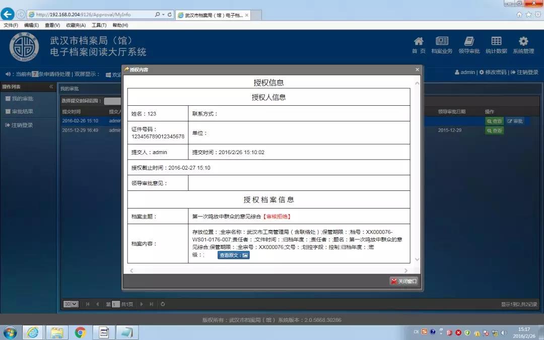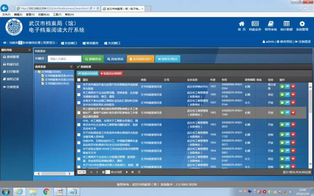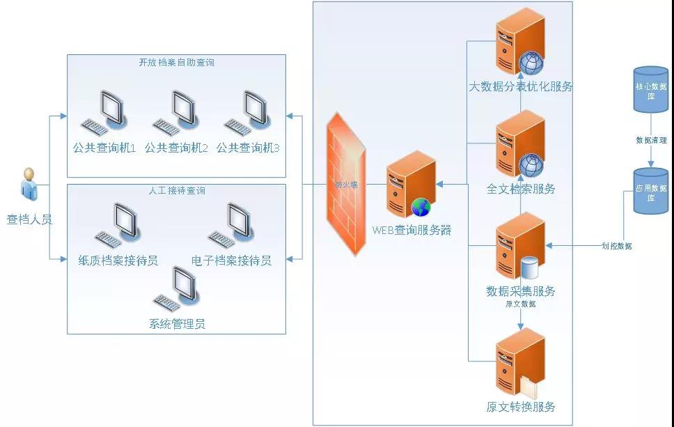 系統(tǒng)根據(jù)檔案局(館)檔案查詢業(yè)務(wù)辦理的工作實(shí)際情況,將傳統(tǒng)手工登記、紙質(zhì)目錄查閱、人工調(diào)卷轉(zhuǎn)變?yōu)橛?jì)算機(jī)全程網(wǎng)絡(luò)在線辦理,同時(shí)利用身份證讀取、消息隊(duì)列、大數(shù)據(jù)量跨庫(kù)檢索等先進(jìn)技術(shù)手段,在確保檔案資源安全可控的前提下,為查檔者提供高效、便捷檔案利用服務(wù)。系統(tǒng)分為四個(gè)模塊,分別是:用戶身份注冊(cè)及驗(yàn)證模塊、查檔模塊、閱讀模塊、管理模塊。其中查檔模塊和閱讀模塊是由公共服務(wù)電腦運(yùn)行,提供給進(jìn)館查檔者使用,管理模塊由柜臺(tái)的管理員電腦運(yùn)行,提供給管理員進(jìn)行各種業(yè)務(wù)辦理和系統(tǒng)管理。
